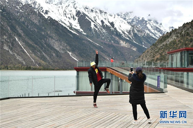 5月24日,游客在營地的觀景臺上拍照留念。