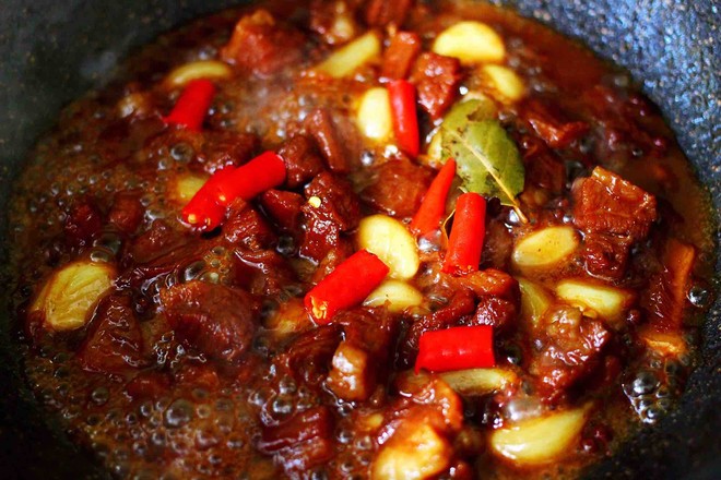 17.小火繼續(xù)燉煮至牛肉和大蒜變得軟糯的時(shí)候。