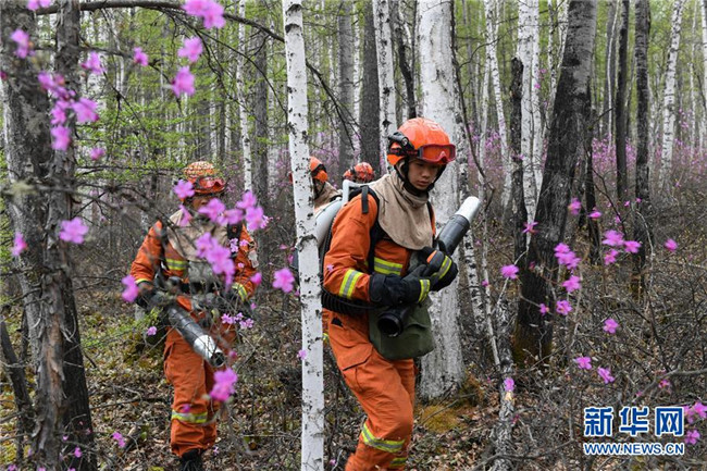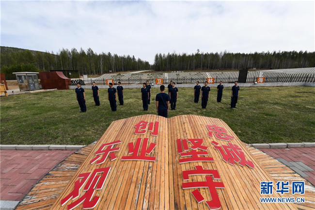 這是內(nèi)蒙古森林消防總隊(duì)大興安嶺支隊(duì)奇乾中隊(duì)的營地,營地后山上的“忠誠”二字是用白樺樹樹干拼接而成(5月15日攝)。新華社記者 劉磊 攝