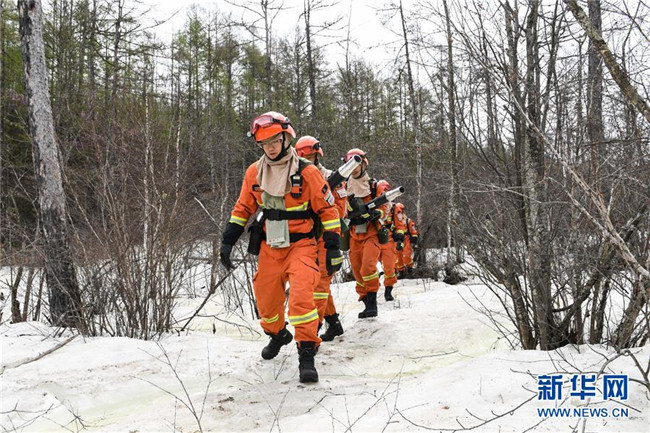 奇乾中隊(duì)消防隊(duì)員在戶外進(jìn)行綜合訓(xùn)練時經(jīng)過一片暫未消融的冰雪(5月19日攝)。新華社記者 劉磊 攝