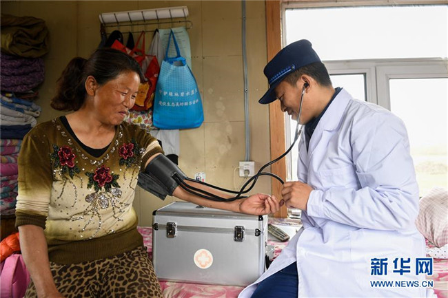 奇乾中隊(duì)隊(duì)醫(yī)為營地附近僅有的幾戶村民測量血壓(5月19日攝)。新華社記者 劉磊 攝