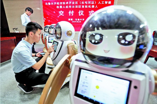 6月10日,在烏魯木齊經(jīng)濟技術開發(fā)區(qū)(頭屯河區(qū))維泰大廈,新疆創(chuàng)澤機器人科技有限公司工程師在調(diào)試機器人“創(chuàng)創(chuàng)”。 當日,該公司生產(chǎn)的75臺人工智能機器人正式交付經(jīng)開區(qū)(頭屯河區(qū))政務服務、社區(qū)、學校等場所,這也標志著烏魯木齊經(jīng)開區(qū)(頭屯河區(qū))國家級人工智能機器人應用示范區(qū)正式啟動。(謝龍)