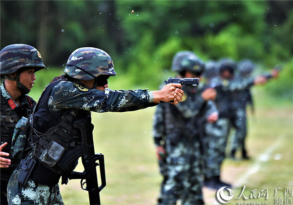 訓練期間,射擊場突降大雨,雨水順著頭盔滑過特戰(zhàn)隊員們的臉龐,給射擊瞄準帶來了不小的影響,在步手槍連續(xù)快速射擊課目中取了得10發(fā)10中好成績的特戰(zhàn)隊員林意鋒告訴筆者:“戰(zhàn)場上有很多不可預見性,幾秒鐘都可能決定成敗,我覺得無論刮風下雨,只有牢牢掌握這種絕對快相對準的射擊本領,才能更高效地完成各類反恐處突任務。”(沈泉池、朱洋洋、余海洋)