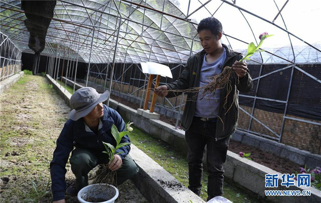 6月12日,在四川黃龍管理局花卉培育基地,林業(yè)高級工程師周聽鴻(左)準備移栽人工保育的杓蘭。新華社記者江宏景攝