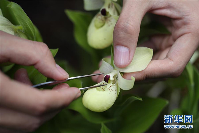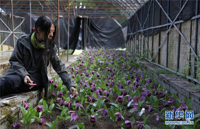 6月12日,在四川黃龍管理局花卉培育基地,四川黃龍自然保護區(qū)的高級顧問干文清在給人工保育的杓蘭標注標識。 新華社記者江宏景攝
