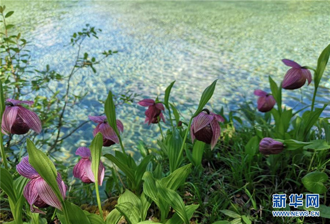 這是在四川黃龍自然保護區(qū)黃龍溝鈣化池邊拍攝的西藏杓蘭(6月12日攝)。 新華社記者江宏景攝
