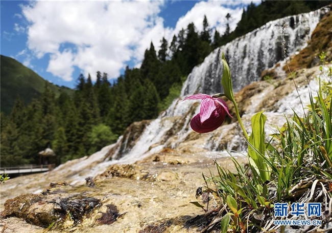 這是在四川黃龍自然保護區(qū)黃龍溝瀑布邊拍攝的西藏杓蘭(6月12日攝)。 新華社記者江宏景攝