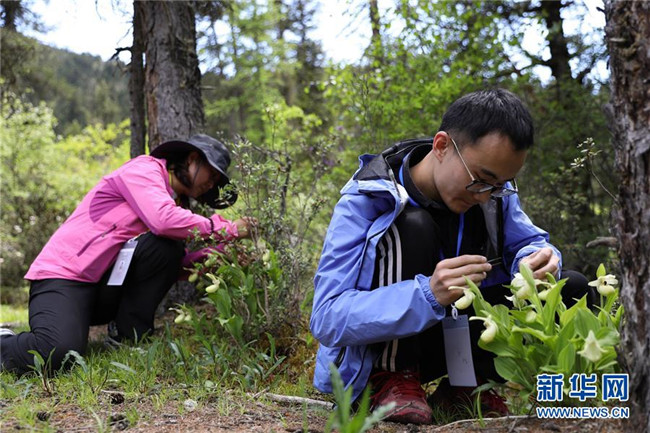 6月12日,在四川黃龍自然保護區(qū)黃龍溝,來自北京植物園的研究員徐可(右)和王濤在給黃花杓蘭進行異花授粉。新華社記者江宏景攝