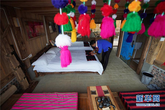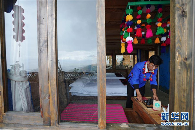 在云南省芒市三臺山德昂族鄉(xiāng)出冬瓜老寨,趙臘退在他的民宿“上上居”整理客房床鋪(6月19日攝)。 新華社記者 秦晴 攝