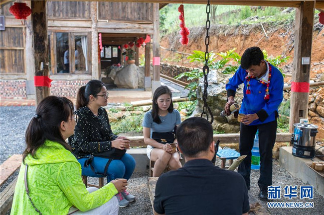 在云南省芒市三臺山德昂族鄉(xiāng)出冬瓜老寨,趙臘退(右)在民宿給客人倒酸茶(6月19日攝)。新華社記者 胡超 攝