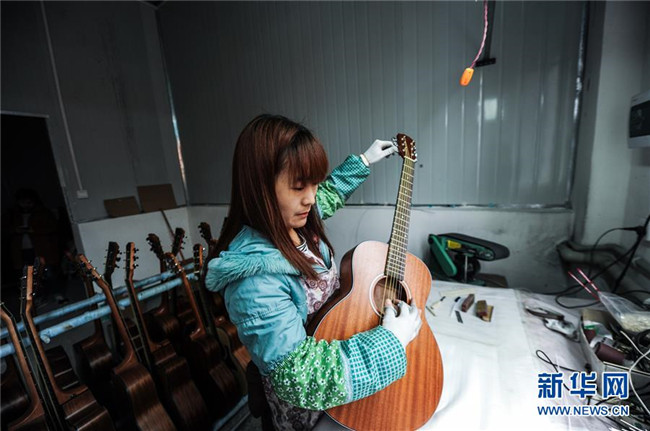 調(diào)音師在貴州省正安縣“正安·國際吉他產(chǎn)業(yè)園”為吉他校對音準(zhǔn)(2017年3月28日攝)。新華社記者 陶亮 攝