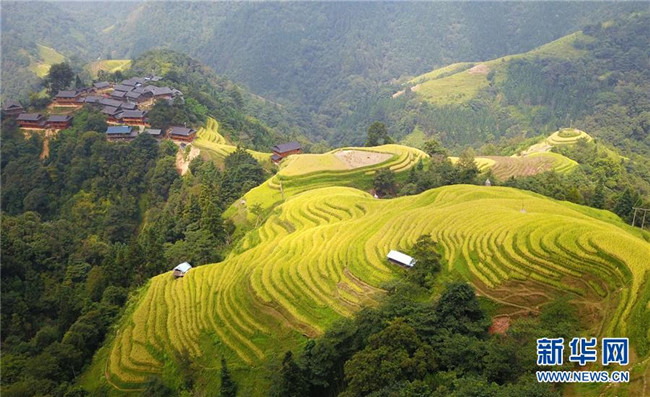 這是9月17日無(wú)人機(jī)拍攝的貴州省榕江縣計(jì)劃鄉(xiāng)計(jì)劃村陽(yáng)開苗寨梯田。