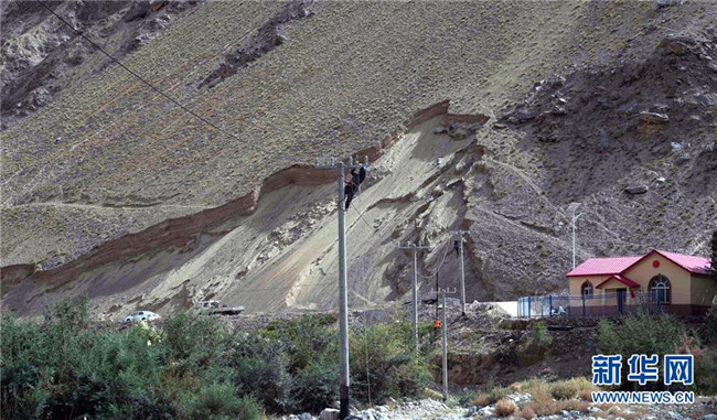 在新疆喀什地區(qū)塔什庫爾干塔吉克自治縣馬爾洋鄉(xiāng),工人在登桿布線(9月7日攝)。 新華社記者 張嘯誠 攝