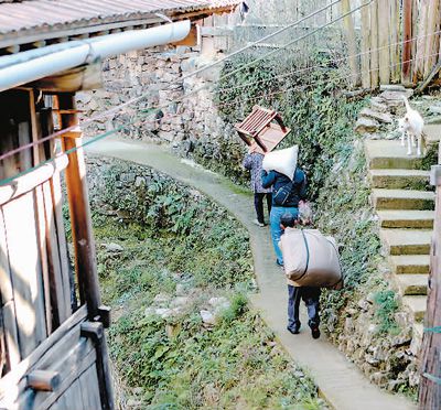 楊昌儒(右)與妻子姜建元(中)、兒子楊海林將行李搬上車,準備前往縣城安置點。