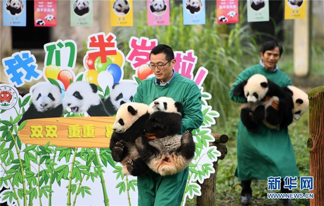 12月22日,飼養(yǎng)員懷抱大熊貓寶寶到戶外運(yùn)動。當(dāng)日,重慶動物園為4只大熊貓寶寶“雙雙”“重重”“喜喜”“慶慶”舉行半歲生日慶祝活動。4只半歲大熊貓在飼養(yǎng)員的照料下,在熊貓館運(yùn)動場內(nèi)玩耍、嬉戲,與市民游客一同過冬至。新華社記者唐奕攝