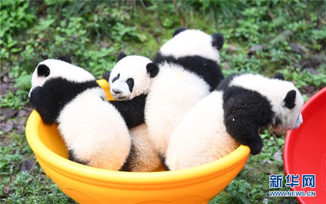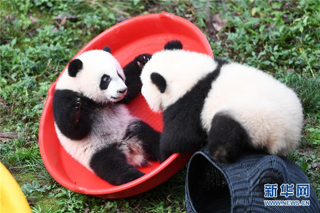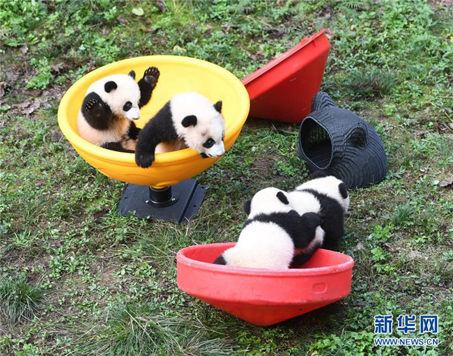 12月22日,重慶動物園4只半歲大熊貓在玩耍。當(dāng)日,重慶動物園為4只大熊貓寶寶“雙雙”“重重”“喜喜”“慶慶”舉行半歲生日慶祝活動。4只半歲大熊貓在飼養(yǎng)員的照料下,在熊貓館運(yùn)動場內(nèi)玩耍、嬉戲,與市民游客一同過冬至。新華社記者唐奕攝
