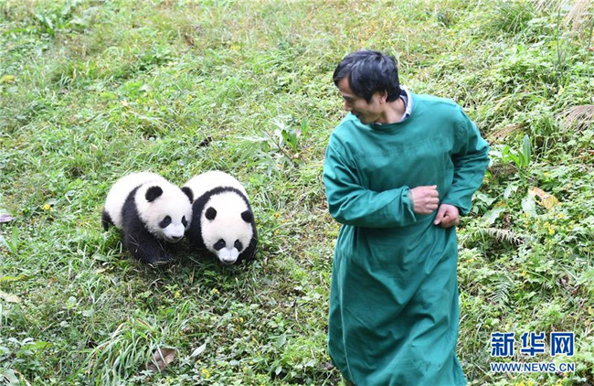 12月22日,飼養(yǎng)員引導(dǎo)兩只半歲大熊貓在戶外運(yùn)動。當(dāng)日,重慶動物園為4只大熊貓寶寶“雙雙”“重重”“喜喜”“慶慶”舉行半歲生日慶?;顒?。4只半歲大熊貓在飼養(yǎng)員的照料下,在熊貓館運(yùn)動場內(nèi)玩耍、嬉戲,與市民游客一同過冬至。新華社記者唐奕攝