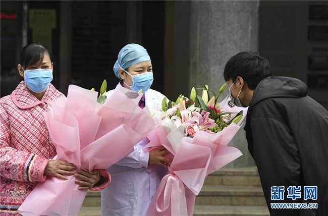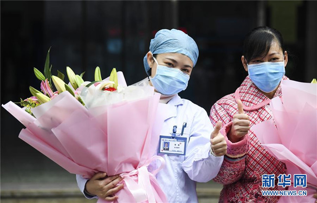 1月29日,在重慶三峽中心醫(yī)院,治愈患者蔣某的家屬(右)向主管護士送花表示感謝。 新華社記者王全超攝+
