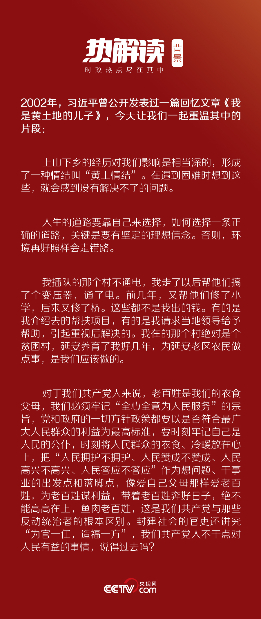 早在十幾年前,習(xí)近平就曾在《我是黃土地的兒子》一文中提到過“情結(jié)”二字。他說,上山下鄉(xiāng)的經(jīng)歷對(duì)我們影響是相當(dāng)深的,形成了一種情結(jié)叫“黃土情結(jié)”。