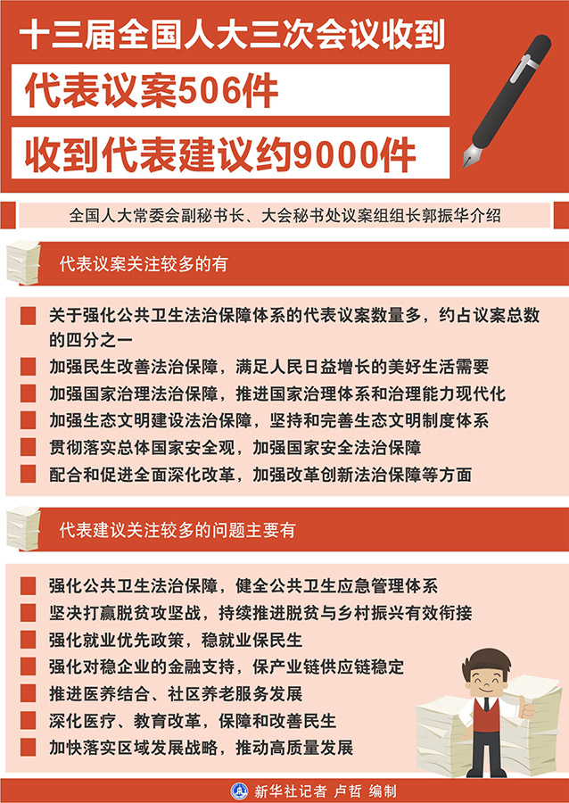 記者26日從十三屆全國(guó)人大三次會(huì)議秘書(shū)處獲悉,到大會(huì)主席團(tuán)決定的代表提出議案截止時(shí)間5月25日12時(shí),大會(huì)秘書(shū)處共收到代表提出的議案506件。同時(shí),收到代表建議約9000件。