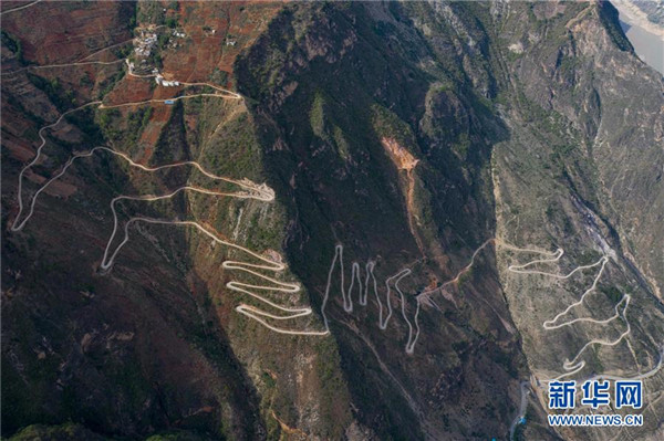 金陽縣蘆稿鎮(zhèn)大灣子村12公里左右的通村公路,28個彎蜿蜒盤旋在金沙江峽谷懸崖絕壁邊(6月7日攝,無人機照片)。坐落在金沙江畔的四川省金陽縣是國家級深度貧困縣,境內(nèi)群山連綿起伏,海拔落差大,眾多村寨處于高山或者高半山上,道路施工難度大。近年來,當(dāng)?shù)卣畬⒔煌ㄗ鳛槊撠毠缘南葘?dǎo)性工程,路越修越寬、越修越好,成為當(dāng)?shù)厝罕姷拿撠氈赂宦贰=刂?019年底,金陽縣實現(xiàn)所有鄉(xiāng)鎮(zhèn)通油路、建制村通硬化路,鄉(xiāng)道里程達329.9公里,村道里程達866.8公里。新華社記者江宏景攝