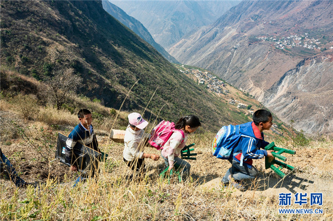 李本艷姐弟倆從家門口沿著崎嶇的山路走到學校,要近兩個小時,每走一步,腳下都是數(shù)百米高的懸崖。搬家后,姐弟倆帶著書包和小板凳離開(攝于4月1日)。新華網發(fā)(鮑禹 攝)