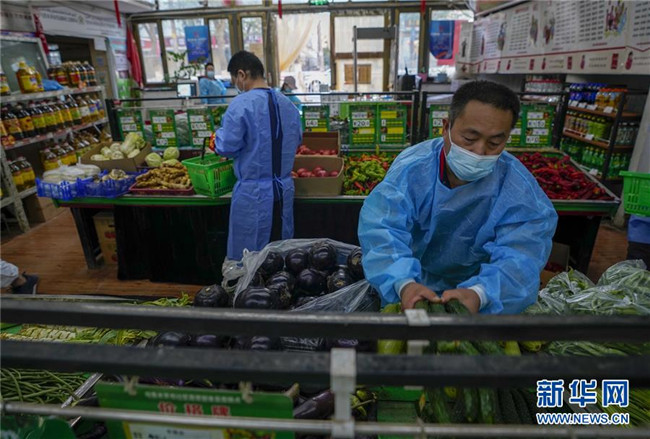 在烏魯木齊市沙依巴克區(qū)揚子江街道青松苑社區(qū)蔬菜直銷點,陳金奇(前)幫助為小區(qū)居民采買的志愿者按照網(wǎng)絡(luò)訂單挑選蔬菜(8月8日攝)。新華社記者 趙戈 攝