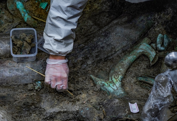 一鍬一鏟,叩問大地緘默。一擔(dān)一籃,剝除歷史塵封。三星堆遺址4號(hào)坑發(fā)掘人員許丹陽,每天的大部分工作就是拿著各種小刷子小鏟子刨土挖土。許丹陽也是一位90后,生于95年的他,去年從北京大學(xué)考古文博學(xué)院研究生畢業(yè)后,進(jìn)入到四川省文物考古研究院工作。此次“入坑”三星堆,已經(jīng)是他的第二次。在2018年時(shí),正在攻讀研究生的許丹陽就已經(jīng)來過三星堆進(jìn)行學(xué)術(shù)研究,而這次剛參加工作就加入了三星堆祭祀?yún)^(qū)新一輪考古的隊(duì)伍,負(fù)責(zé)最先啟動(dòng)的4號(hào)坑發(fā)掘,他感覺正逢其時(shí)。