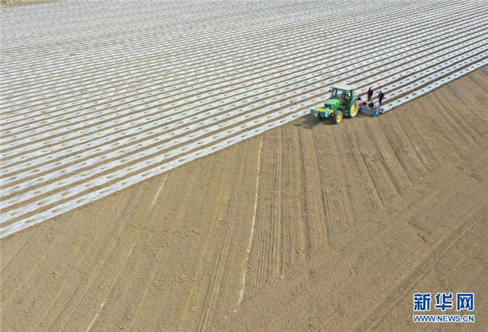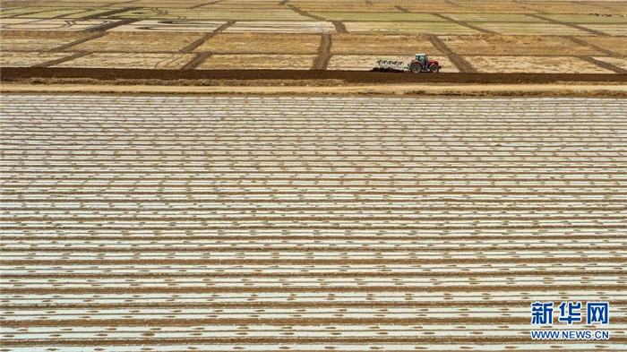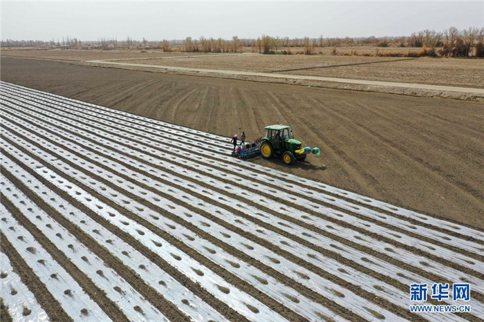 在新疆尉犁縣塔里木鄉(xiāng)英努爾村,農(nóng)民駕駛大馬力拖拉機(jī)在棉田里進(jìn)行鋪膜作業(yè)(3月28日攝)。新華社發(fā)(汪志鵬 攝)