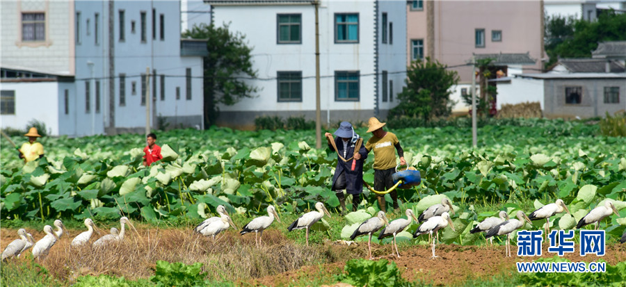近日,云南省彌勒市竹園鎮(zhèn)農(nóng)民在荷田間勞作,不遠(yuǎn)處許多鉗嘴鸛在田邊地頭棲息覓食,一幅人鳥(niǎo)和諧的生態(tài)畫(huà)卷徐徐展開(kāi)。2006年,中國(guó)在云南大理首次記錄到鉗嘴鸛。近年來(lái),隨著生態(tài)環(huán)境不斷改善,云南多地均發(fā)現(xiàn)鉗嘴鸛。新華網(wǎng)發(fā)(普佳勇攝影報(bào)道)