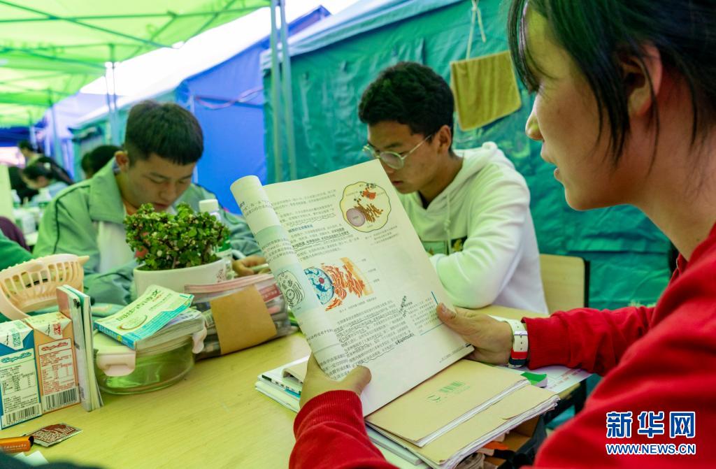 記者在這個特殊的“帳篷課堂”看到,學生們有的正在集中做著卷子,有的在復習課文,老師在一旁耐心講解。遠處,空置的教學樓懸掛著條幅,上面寫著“用拼搏的汗水灌注無悔的高三路 考前不怕 考后不悔”。
