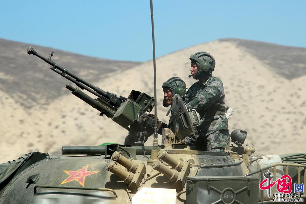 新疆軍區(qū)某合成團坦克二連政治指導(dǎo)員馬和帕麗(右一)組織戰(zhàn)術(shù)訓(xùn)練的情景。袁凱 攝