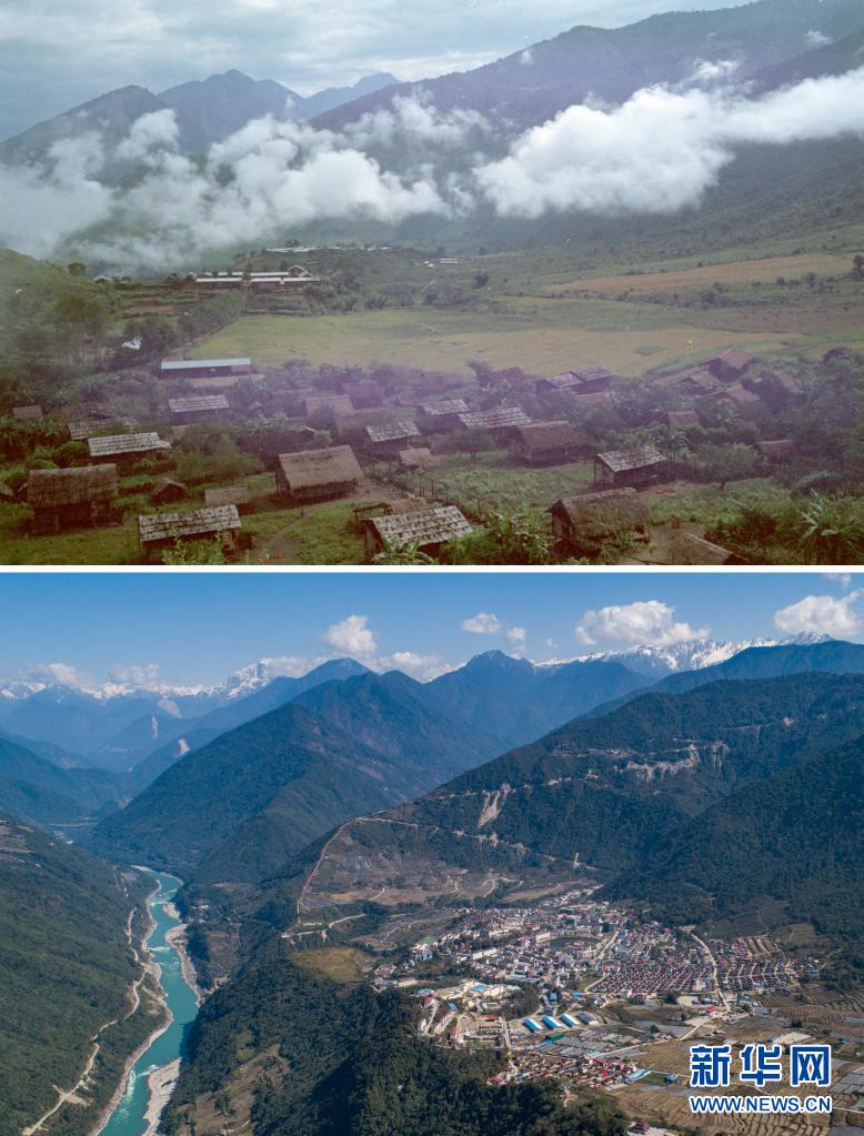 拼版照片:上圖是20世紀(jì)80年代的墨脫縣景色(新華社記者才龍攝);下圖是2021年2月13日拍攝的墨脫縣風(fēng)光(新華社記者孫非攝,無人機照片)。新華社發(fā)