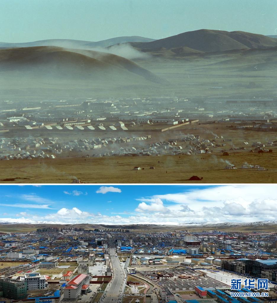拼版照片:上圖是20世紀(jì)80年代的西藏那曲地區(qū)行署所在地那曲鎮(zhèn)(新華社記者袁克忠攝);下圖是那曲市市區(qū)風(fēng)貌(新華社發(fā) 普布扎西攝,無人機視頻截圖)。新華社發(fā)