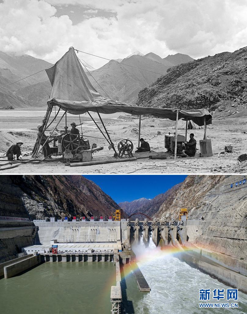 拼版照片:上圖是20世紀(jì)50年代,西藏工程勘察隊鉆探組在選定的拉薩水力發(fā)電廠廠址,用從東北雞西礦務(wù)局機械總廠運來的鉆探機進行鉆探(新華社記者任用昭攝);下圖是2018年10月26日拍攝的西藏首座大型水電站——藏木水電站(新華社發(fā) 董志雄攝)。新華社發(fā)