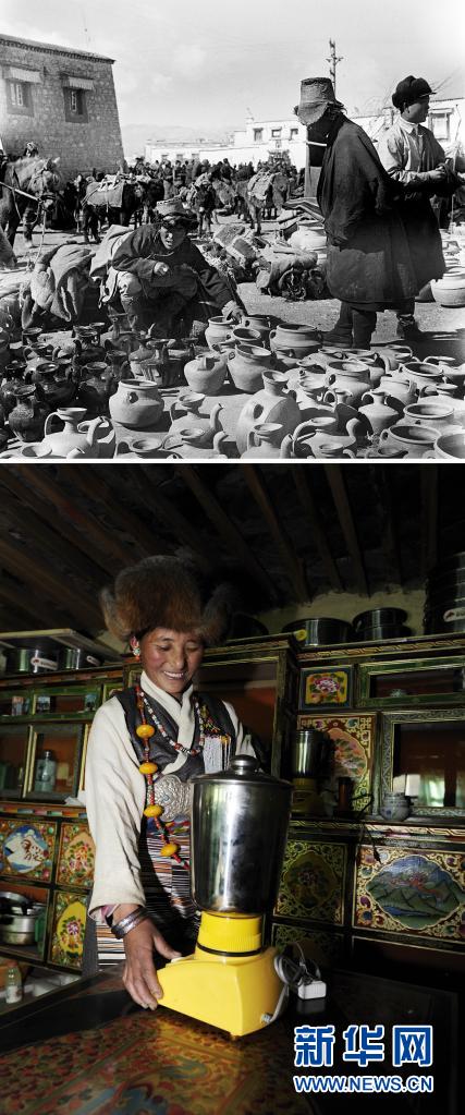 拼版照片:上圖是20世紀(jì)50年代,拉薩居民購買酥油茶壺(新華社記者任用昭攝);下圖是2011年12月12日,西藏日喀則拉孜縣吉角村村民倉決用電動酥油茶攪拌機給家人打酥油茶(新華社記者普布扎西攝)。新華社發(fā)