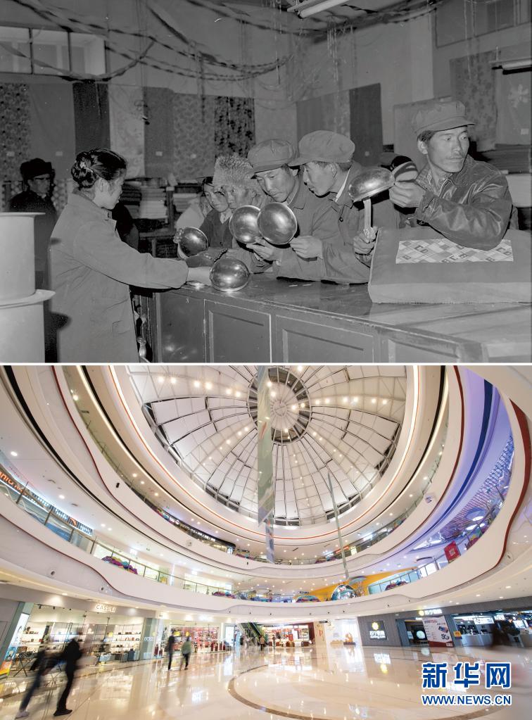 拼版照片:上圖是20世紀(jì)80年代,人們在拉薩一家商店購物(新華社發(fā) 劉麗嘉攝);下圖是2021年8月15日,人們在拉薩市萬達廣場購物(新華社記者孫非攝)。新華社發(fā)