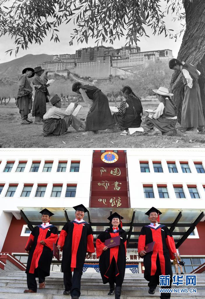 拼版照片:上圖是20世紀(jì)50年代,拉薩小學(xué)的學(xué)生在布達拉宮前練習(xí)寫生(新華社記者任用昭攝);下圖是2017年11月10日,西藏本土培養(yǎng)的首批博士研究生畢業(yè)(新華社記者覺果攝)。新華社發(fā)