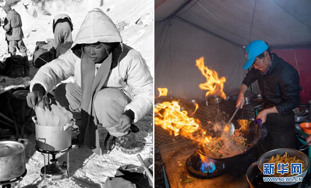 拼版照片:左圖是20世紀(jì)60年代,我國登山隊員在海拔5700米冰川上宿營時融冰煮飯(新華社記者陳宗烈攝);右圖是2020年5月10日,廚師在海拔6500米的前進營地炒菜(新華社記者孫非攝)。新華社發(fā)