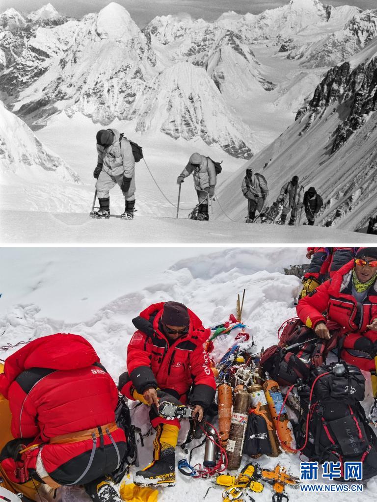 拼版照片:上圖是1960年,登山隊隊員在海拔7000米以上的雪坡上前進(資料照片);下圖是2020年5月21日拍攝的2020珠峰高程測量登山隊員所使用的現(xiàn)代登山設(shè)備(新華社特約記者拉巴攝)。新華社發(fā)