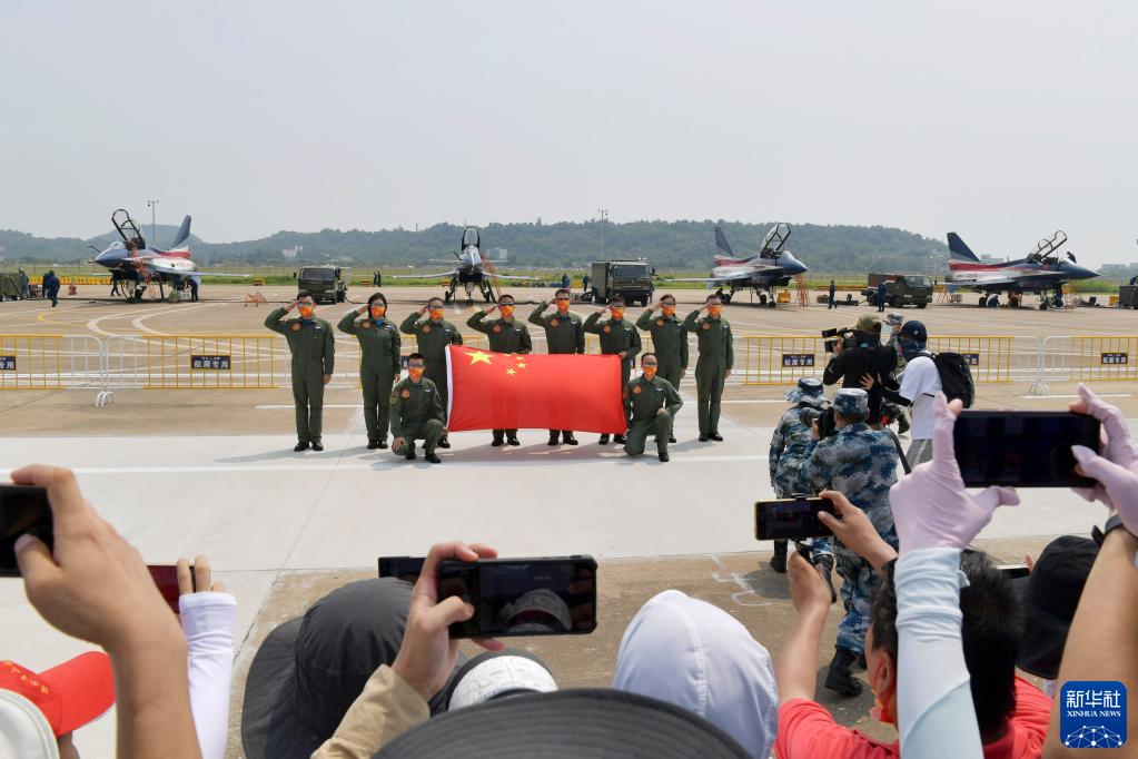 10月1日,在第十三屆中國(guó)國(guó)際航空航天博覽會(huì)上,中國(guó)空軍八一飛行表演隊(duì)飛行員舉國(guó)旗向觀(guān)眾致意。新華社記者 琚振華 攝