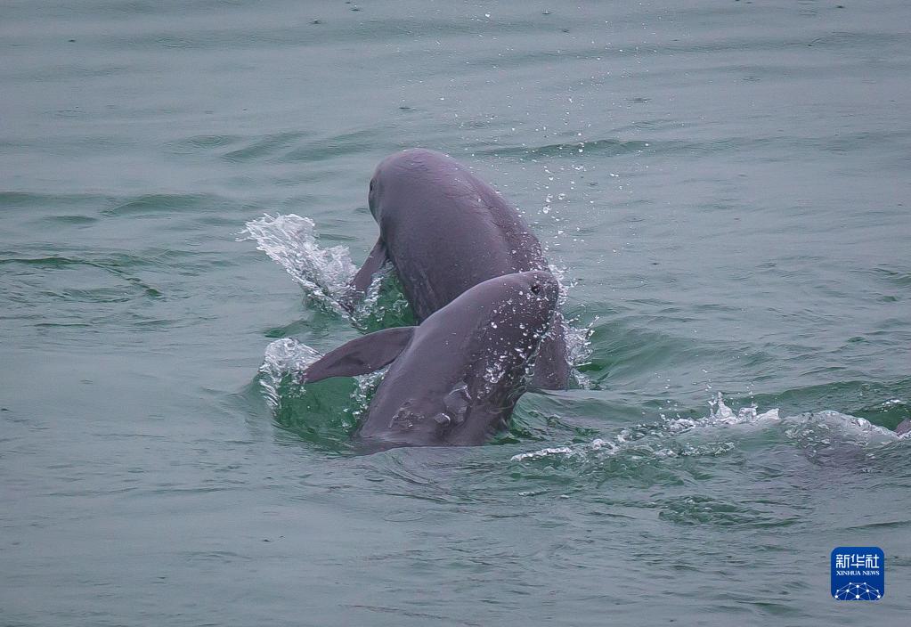 5月10日,在湖北省宜昌市江邊,長江江豚在水中嬉戲。新華社記者 肖藝九 攝