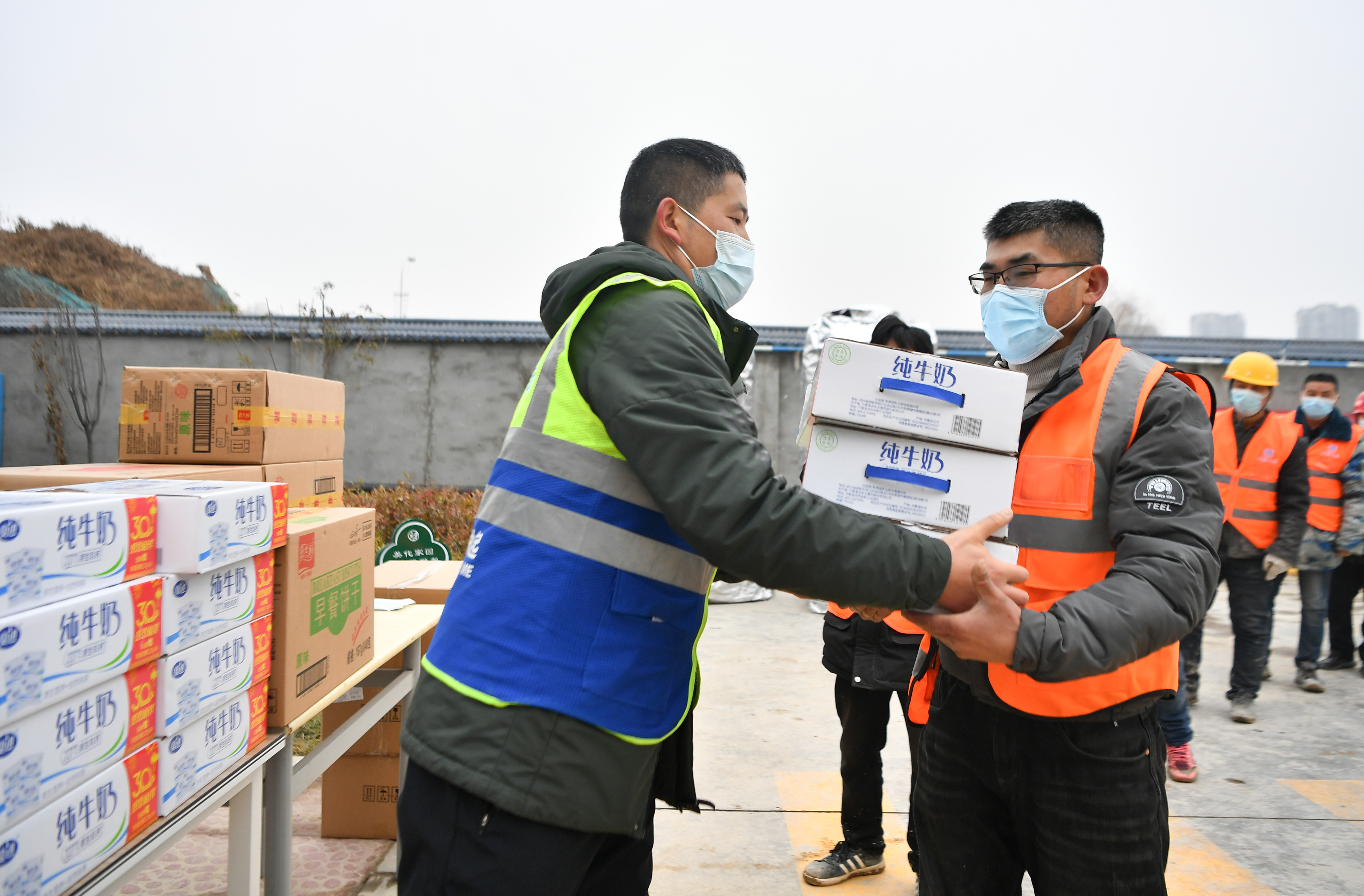 1月30日,在西安市第一實(shí)驗(yàn)學(xué)校建設(shè)項(xiàng)目工地,管理人員(左)向留守工地的工人發(fā)放生活物資。新華社記者 張博文 攝