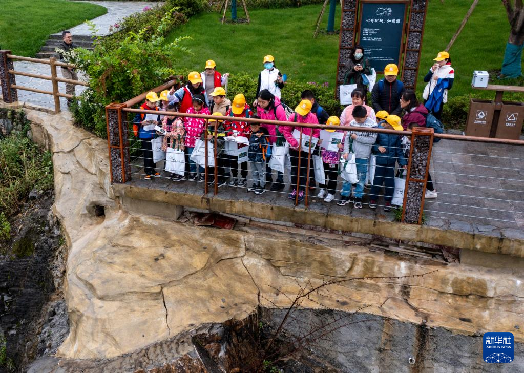 4月17日,地學(xué)旅游愛(ài)好者、中小學(xué)生和部分媒體工作者在地質(zhì)專業(yè)工作人員的帶領(lǐng)下,對(duì)銅鑼山礦山公園的地質(zhì)遺跡和生態(tài)修復(fù)進(jìn)行科學(xué)考察(無(wú)人機(jī)照片)。