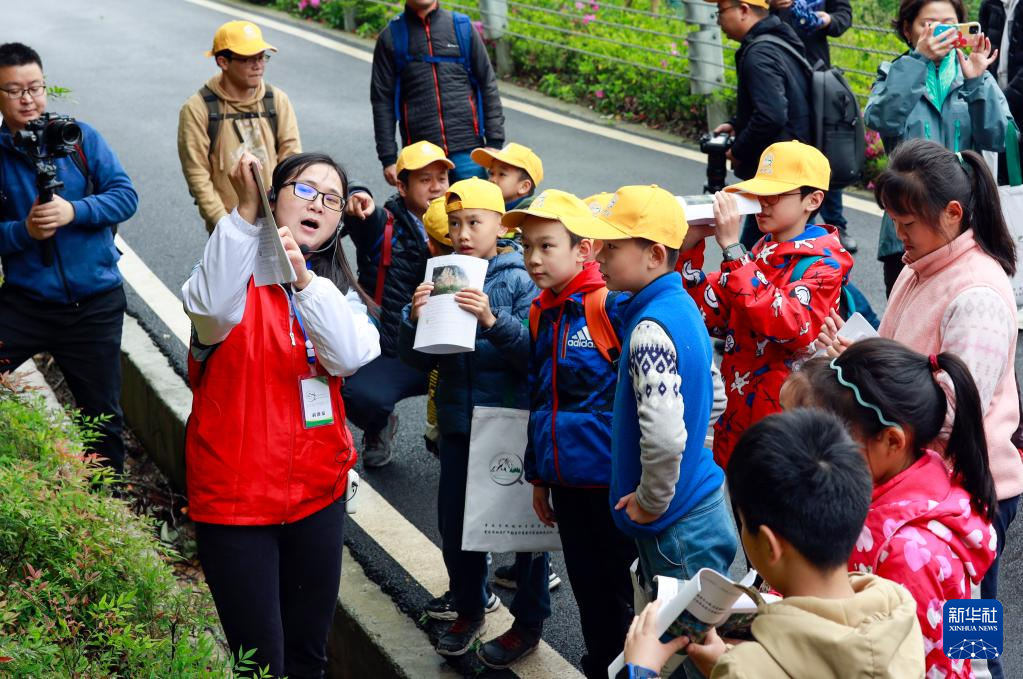 4月17日,參加活動(dòng)的地學(xué)旅游愛(ài)好者、中小學(xué)生和部分媒體工作者,在地質(zhì)專業(yè)工作人員的帶領(lǐng)下進(jìn)行銅鑼山科學(xué)考察。