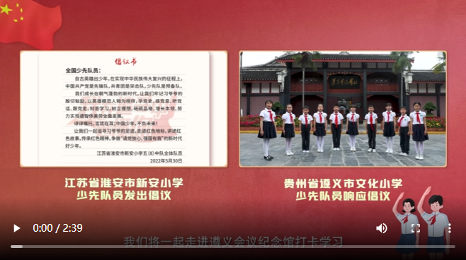 2022年5月30日,是江蘇省淮安市新安小學少先隊員們收到習近平總書記回信一周年的日子。近日,他們向全國少先隊員發(fā)出“跟著習爺爺?shù)淖阚E學黨史”的倡議。貴州省遵義市文化小學的少先隊員們第一時間響應倡議,追尋習爺爺?shù)淖阚E,打卡遵義會議紀念館,講述紅色故事,傳承紅色基因。
