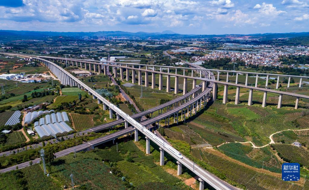 8月23日,綜合檢測(cè)車在彌蒙高鐵彌勒站附近上行線行駛,遠(yuǎn)處是下行線,中間橫向鐵路是南寧至昆明客運(yùn)專線,下穿高速是瀘彌高速(無人機(jī)照片)。新華社記者 陳欣波 攝