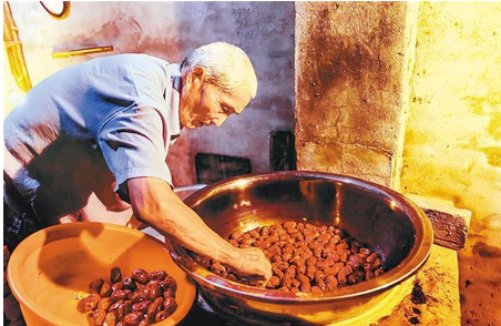 丁健榮亳無保留地講述了他制作甑糕的傳統(tǒng)工藝:甑糕原料是江米、大棗,其比例為每鍋江米10公斤,大棗3公斤,蒸制的每個步驟都有嚴格要求。第一步,選優(yōu)質(zhì)江米浸泡在清水里5個小時左右,紅棗、蜜棗浸泡2小時后備用;第二步,江米浸泡好后,用笊籬把江米撈出瀝水,倒入鋪好的篩子里再次瀝水;第三步,江米瀝干水后上蒸鍋燒1個小時把米撈出來滲水(適宜即可);第四步,先在鍋底鋪一層棗和蜜棗,再鋪一層米,共鋪三層;第五步,蓋好鍋,用調(diào)好的面糊涂在鍋的四周封閉;第六步,點火燒一個半小時,上氣后改為小火(鍋底不能斷火);第七步,第二天清晨5時加熱燒半小時關(guān)火開蓋。經(jīng)過這一系列程序加工后,熱氣騰騰的紅棗江米香味撲鼻而來,傳統(tǒng)甑糕就大功告成了。
