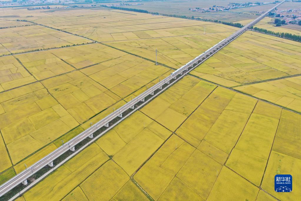高鐵列車從吉林省公主嶺市沃野間駛過(2021年9月19日攝,無人機照片)。新華社記者 張楠 攝