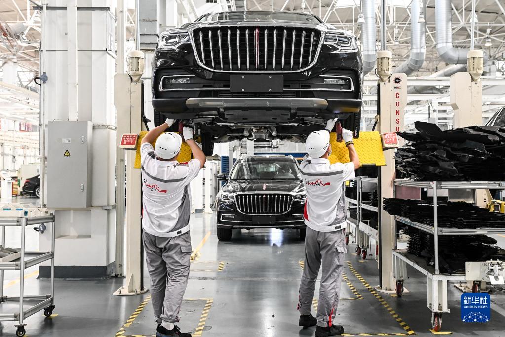 工人在位于吉林長春的一汽紅旗工廠總裝車間內(nèi)裝配車輛(2021年7月1日攝)。新華社記者 顏麟蘊 攝